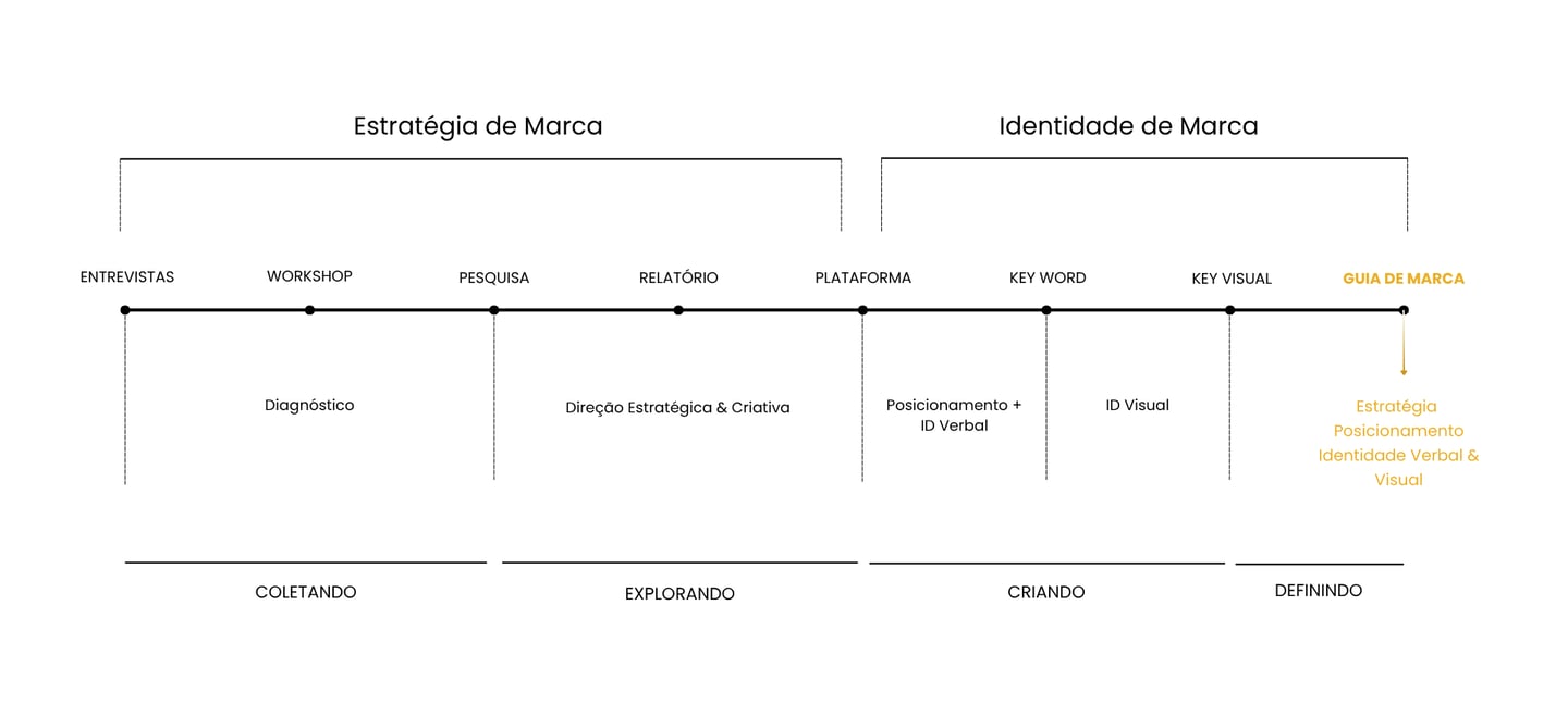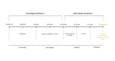 Trabalhamos por fases: diagnóstico, estratégia, identidade verbal/visual e implementação. O processo é colaborativo e feito sob medida para o estágio e necessidades da sua empresa.